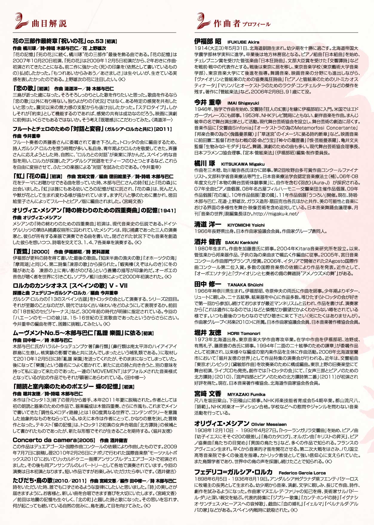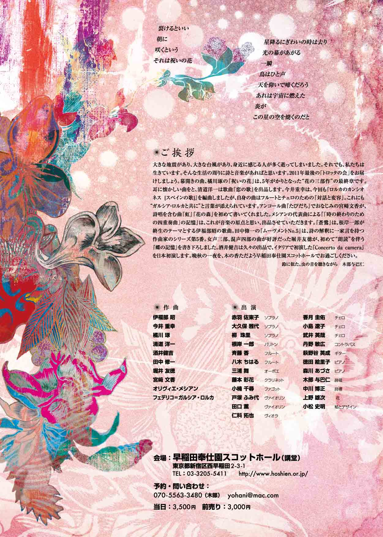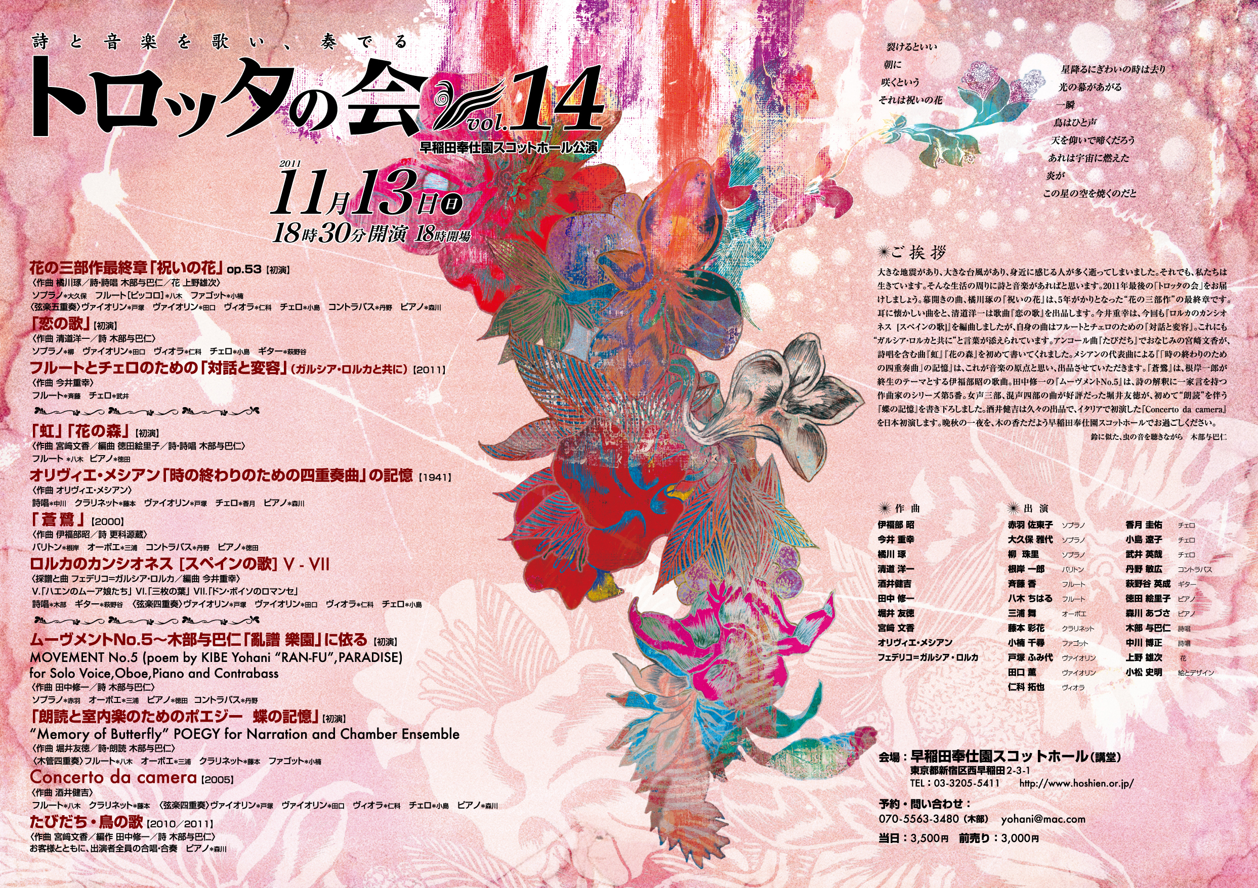 ■ 第14回 トロッタの会 裂けるといい 朝に 咲くという それは祝いの花 星降るにぎわいの時は去り 光の幕があがる 一瞬 鳥はひと声 天を仰いで啼くだろう あれは宇宙に燃えた 炎が この星の空を焼くのだと 2011年11月13日(日)18時30分開演 18時開場 会場・早稲田奉仕園 スコットホール 花の三部作最終章『祝いの花』op.53【初演】 〈作曲 橘川琢/詩・詩唱 木部与巴仁/花 上野雄次〉 ソプラノ/大久保雅代 フルート[ピッコロ]/八木ちはる ヴァイオリン/戸塚ふみ代 ヴァイオリン/田口薫 ヴィオラ/仁科拓也 チェロ/小島遼子 コントラバス/丹野敏広 ピアノ/森川あづさ《やむを得ない事情により、当初予定のファゴットは演奏されませんでした》 『恋の歌』【初演】 〈作曲 清道洋一/詩 木部与巴仁〉 ソプラノ/柳珠里 ヴァイオリン/田口薫 ヴィオラ/仁科拓也 チェロ/小島遼子 ギター/萩野谷英成 フルートとチェロのための『対話と変容』(ガルシア・ロルカと共に)【2011】 〈作曲 今井重幸〉 フルート/斎藤香 チェロ/武井英哉 〈休憩〉 『虹』『花の森』【初演】 〈作曲 宮崎文香/編曲/徳田絵里子/詩・詩唱 木部与巴仁〉 フルート/八木ちはる ピアノ/徳田絵里子 オリヴィエ・メシアン『時の終わりのための四重奏曲』の記憶【1941】 〈作曲 オリヴィエ・メシアン〉 詩唱/中川博正 クラリネット/藤本彩花 ヴァイオリン/戸塚ふみ代 チェロ/香月圭佑 ピアノ/森川あづさ 『蒼鷺』【2000】 〈作曲 伊福部昭〉 バリトン/根岸一郎 オーボエ/三浦舞 コントラバス/丹野敏広 ピアノ/徳田絵里子 ロルカのカンシオネス [スペインの歌] V - VII 〈採譜と曲 フェデリコ=ガルシア・ロルカ/編曲 今井重幸〉 V.[ハエンのムーア娘たち] VI.[三枚の葉] VII.[ドン・ボイソのロマンセ] 詩唱/木部与巴仁 ギター/萩野谷英成 〈弦楽四重奏〉 ヴァイオリン/戸塚ふみ代 ヴァイオリン/田口薫 ヴィオラ/仁科拓也 チェロ/小島遼子 〈休憩〉 ムーヴメントNo.5*木部与巴仁『亂譜 樂園』に依る【初演】 MOVEMENT No.5 (poem by KIBE Yohani “RAN-FU”, PARADISE) for Solo Voice,Oboe,Piano and Contrabass 〈作曲 田中修一/詩 木部与巴仁〉 ソプラノ/赤羽佐東子 オーボエ/三浦舞 ピアノ/徳田絵里子 コントラバス/丹野敏広 『朗読と室内楽のためのポエジー 蝶の記憶』【初演】 “Memory of Butterfly” POEGY for Narration and Chamber Ensemble 〈作曲 堀井友徳/詩・朗読 木部与巴仁〉 フルート/八木ちはる オーボエ/三浦舞 クラリネット/藤本彩花 チェロ/圭佑香月《やむを得ない事情により、ファゴットがチェロに変更されました》 Concerto da camera【2009】 〈作曲 酒井健吉〉 フルート/八木ちはる クラリネット/藤本彩花 〈弦楽四重奏〉 ヴァイオリン/戸塚ふみ代 ヴァイオリン/田口薫 ヴィオラ/仁科拓也 チェロ/小島遼子 ピアノ/森川あづさ 『たびだち・鳥の歌』【2010/2011】《時間の都合により演奏されませんでした》 〈作曲 宮崎文香/編作 田中修一/詩 木部与巴仁) お客様とともに、出演者全員の合唱・合奏 ピアノ/森川あづさ |