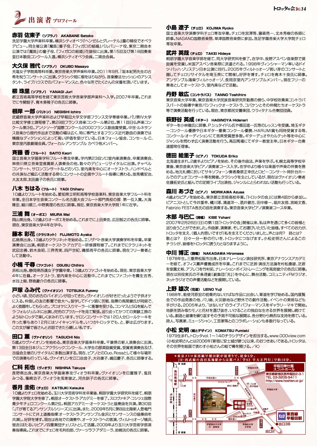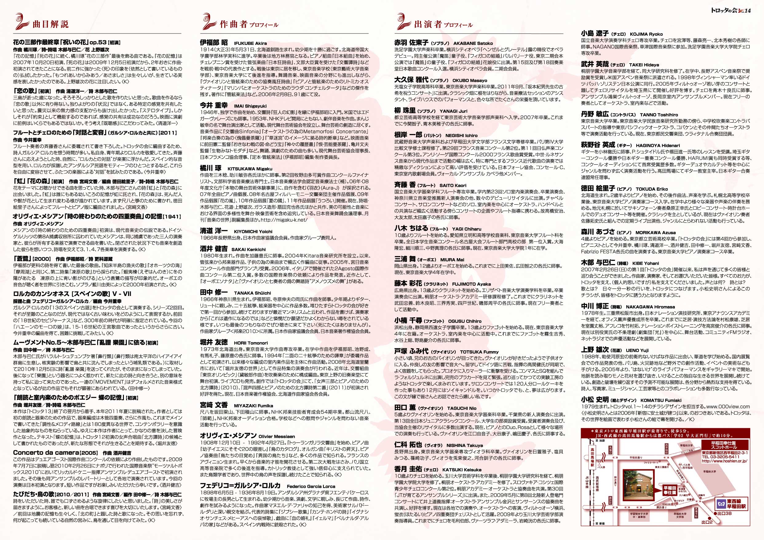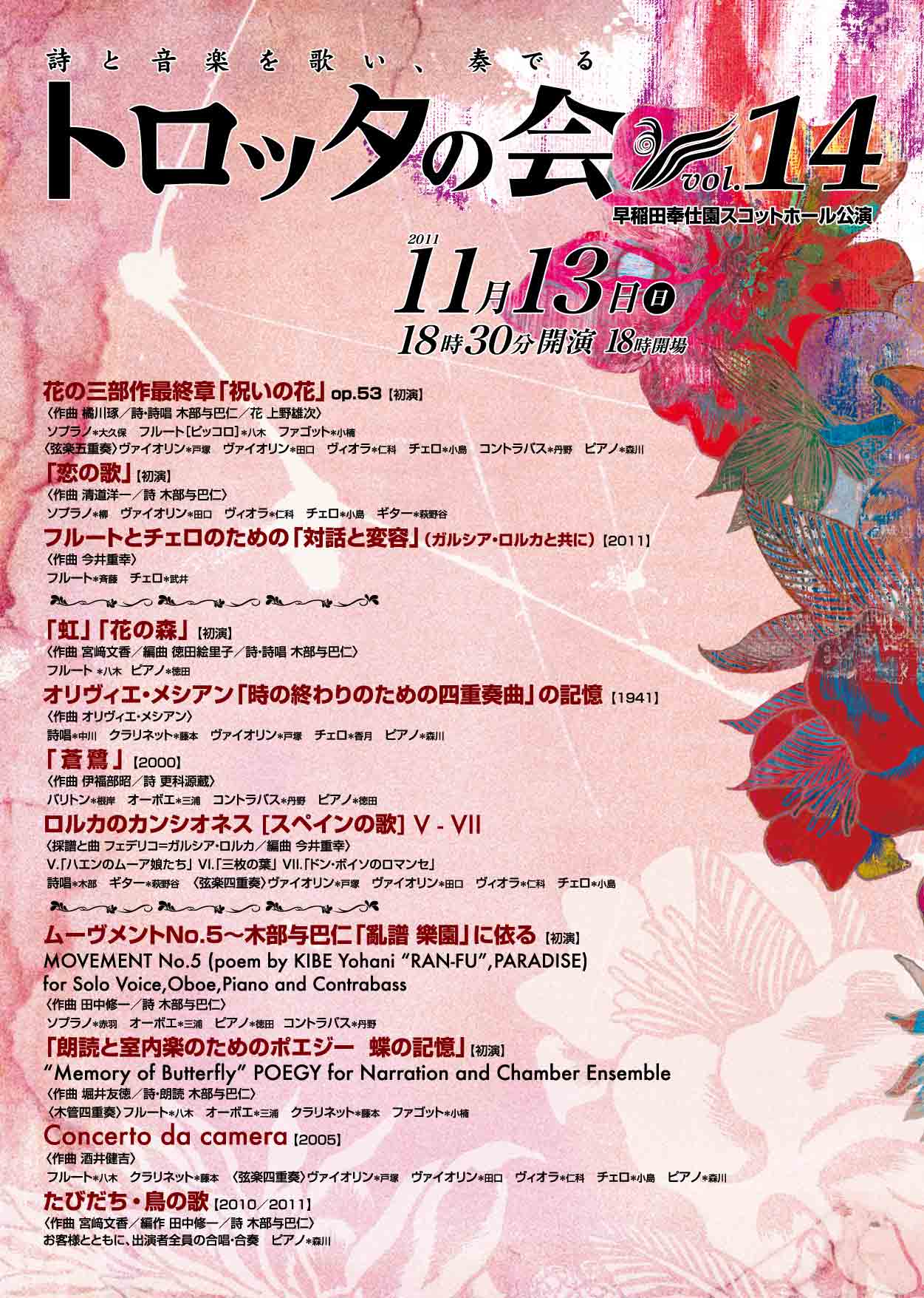 ■ 第14回 トロッタの会 裂けるといい 朝に 咲くという それは祝いの花 星降るにぎわいの時は去り 光の幕があがる 一瞬 鳥はひと声 天を仰いで啼くだろう あれは宇宙に燃えた 炎が この星の空を焼くのだと 2011年11月13日(日)18時30分開演 18時開場 会場・早稲田奉仕園 スコットホール 花の三部作最終章『祝いの花』op.53【初演】 〈作曲 橘川琢/詩・詩唱 木部与巴仁/花 上野雄次〉 ソプラノ/大久保雅代 フルート[ピッコロ]/八木ちはる ヴァイオリン/戸塚ふみ代 ヴァイオリン/田口薫 ヴィオラ/仁科拓也 チェロ/小島遼子 コントラバス/丹野敏広 ピアノ/森川あづさ《やむを得ない事情により、当初予定のファゴットは演奏されませんでした》 『恋の歌』【初演】 〈作曲 清道洋一/詩 木部与巴仁〉 ソプラノ/柳珠里 ヴァイオリン/田口薫 ヴィオラ/仁科拓也 チェロ/小島遼子 ギター/萩野谷英成 フルートとチェロのための『対話と変容』(ガルシア・ロルカと共に)【2011】 〈作曲 今井重幸〉 フルート/斎藤香 チェロ/武井英哉 〈休憩〉 『虹』『花の森』【初演】 〈作曲 宮崎文香/編曲/徳田絵里子/詩・詩唱 木部与巴仁〉 フルート/八木ちはる ピアノ/徳田絵里子 オリヴィエ・メシアン『時の終わりのための四重奏曲』の記憶【1941】 〈作曲 オリヴィエ・メシアン〉 詩唱/中川博正 クラリネット/藤本彩花 ヴァイオリン/戸塚ふみ代 チェロ/香月圭佑 ピアノ/森川あづさ 『蒼鷺』【2000】 〈作曲 伊福部昭〉 バリトン/根岸一郎 オーボエ/三浦舞 コントラバス/丹野敏広 ピアノ/徳田絵里子 ロルカのカンシオネス [スペインの歌] V - VII 〈採譜と曲 フェデリコ=ガルシア・ロルカ/編曲 今井重幸〉 V.[ハエンのムーア娘たち] VI.[三枚の葉] VII.[ドン・ボイソのロマンセ] 詩唱/木部与巴仁 ギター/萩野谷英成 〈弦楽四重奏〉 ヴァイオリン/戸塚ふみ代 ヴァイオリン/田口薫 ヴィオラ/仁科拓也 チェロ/小島遼子 〈休憩〉 ムーヴメントNo.5*木部与巴仁『亂譜 樂園』に依る【初演】 MOVEMENT No.5 (poem by KIBE Yohani “RAN-FU”, PARADISE) for Solo Voice,Oboe,Piano and Contrabass 〈作曲 田中修一/詩 木部与巴仁〉 ソプラノ/赤羽佐東子 オーボエ/三浦舞 ピアノ/徳田絵里子 コントラバス/丹野敏広 『朗読と室内楽のためのポエジー 蝶の記憶』【初演】 “Memory of Butterfly” POEGY for Narration and Chamber Ensemble 〈作曲 堀井友徳/詩・朗読 木部与巴仁〉 フルート/八木ちはる オーボエ/三浦舞 クラリネット/藤本彩花 チェロ/圭佑香月《やむを得ない事情により、ファゴットがチェロに変更されました》 Concerto da camera【2009】 〈作曲 酒井健吉〉 フルート/八木ちはる クラリネット/藤本彩花 〈弦楽四重奏〉 ヴァイオリン/戸塚ふみ代 ヴァイオリン/田口薫 ヴィオラ/仁科拓也 チェロ/小島遼子 ピアノ/森川あづさ 『たびだち・鳥の歌』【2010/2011】《時間の都合により演奏されませんでした》 〈作曲 宮崎文香/編作 田中修一/詩 木部与巴仁) お客様とともに、出演者全員の合唱・合奏 ピアノ/森川あづさ |